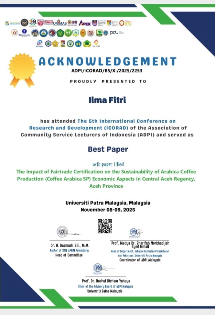 Pada ajang The 5th International Conference on Research and Development (ICORAD) yang diselenggarakan secara hybrid di Auditorium Fakultas Perubatan Veterinar, Universiti Putra Malaysia, salah satu dosen Program Studi Agribisnis Universitas Gajah Putih, Ibu Ilma Fitri, S.P., M.Si., turut berpartisipasi sebagai pemakalah. Dalam forum ilmiah bergengsi tersebut, beliau mempresentasikan artikel berjudul “The Impact of Fairtrade Certification on the Sustainability of Arabica Coffee Production (Coffee Arabica SP): Economic Aspects in Central Aceh Regency, Aceh Province.”